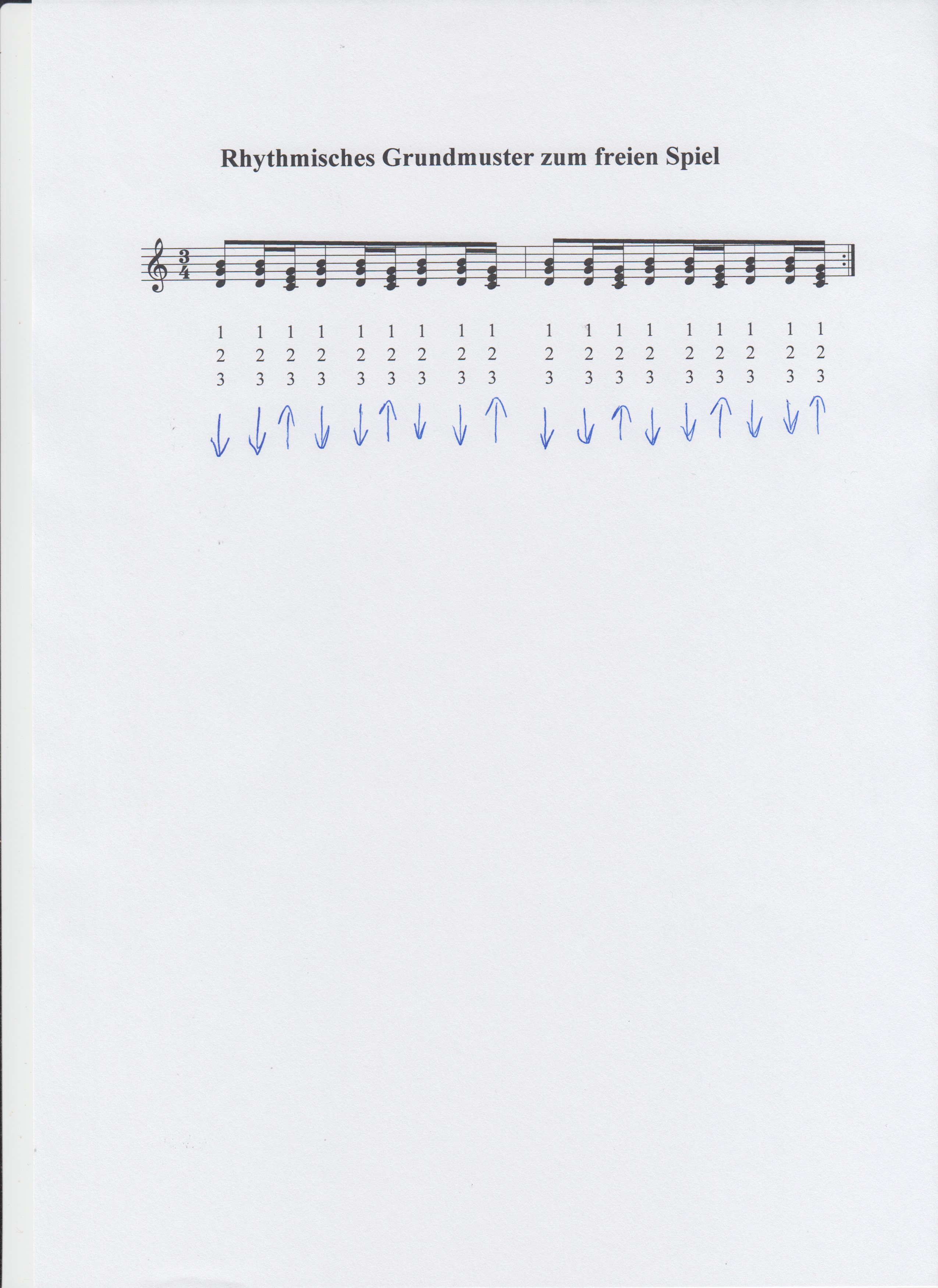 Am Anfang kann man sich diesem Thema mit ein paar wenigen Vorlagen nähern. Hier merkt man dann aber sehr schnell, dass jede Vorlage in kurzer Zeit an seine Grenzen stößt, da sie recht bald langweilig wird. Hier kommt das freie Spiel zum Einsatz. Alle Vorlagen können in der Rhythmik und dem Tonvorrat komplett umgebaut und neu erfunden werden. Spannend ist dabei auch das Experimentieren mit dem Wechsel der verschiedenen Tonan-schlägen im Spiel.